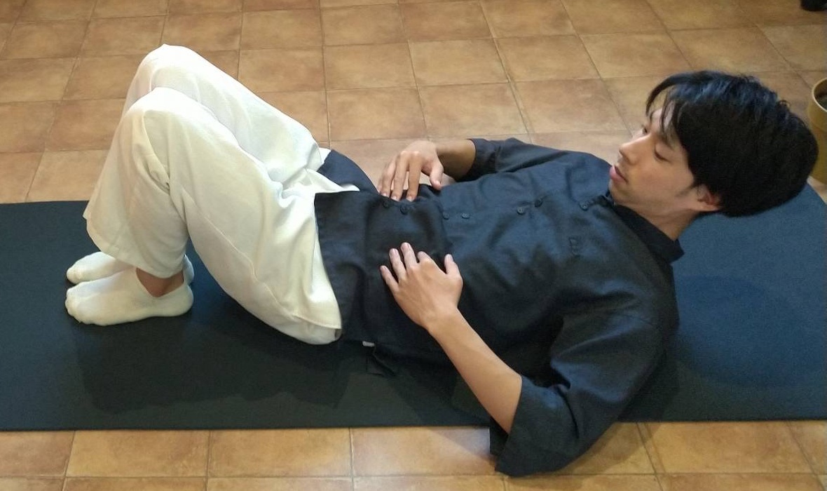 セルフケア セルフケア 体幹 naoto 2021年8月15日 セルフケア 体幹 体幹 やり方 膝を深く曲げ上向きになる。 体幹の筋肉である腹横筋を確認するため、首を持ち上げる。 首を持ち上げると腹直筋が硬くなるので、その横の腹横筋を触れる。 触れたら首を楽にして、鼻から息を吸い口で苦しくなるまでゆっくり吐ききる。吐ききった時に腹横筋が硬くなる。 硬くなるのが感じにくい場合は、体幹がない証拠です。 上記の呼吸法が慣れてきたら次のステップに移ります。 吐ききった後に、口を閉じ鼻で息を吸う。そうすると、胸郭が膨らみより体幹が鍛えられます。